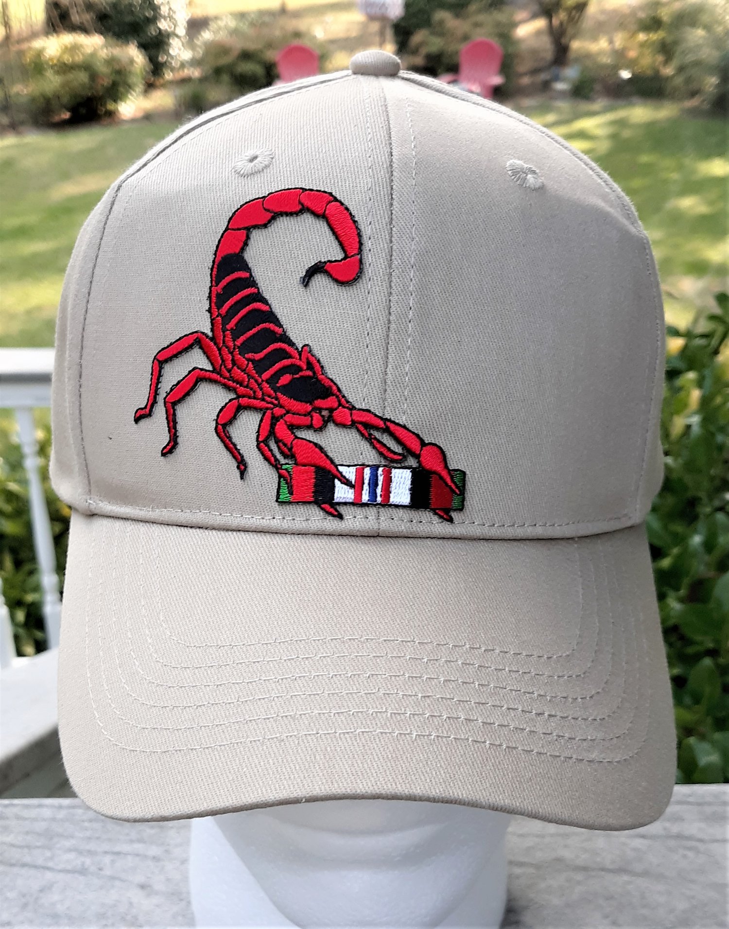 Hey Desert guys. Try this hat on for size. You young guys kept telling me about the scorpions on the desert, so I designed this patch just for you. The hat is a standard structured hat with a vel cro closure on the back for one size fits all. There is nothing like this patch on the market. You are sure to be stopped to ask about the scorpion. Of course I placed in his pinchers your service ribbon. Even if you have a lot of hats, this one in its simplicity will be the number one. Shipping to US only